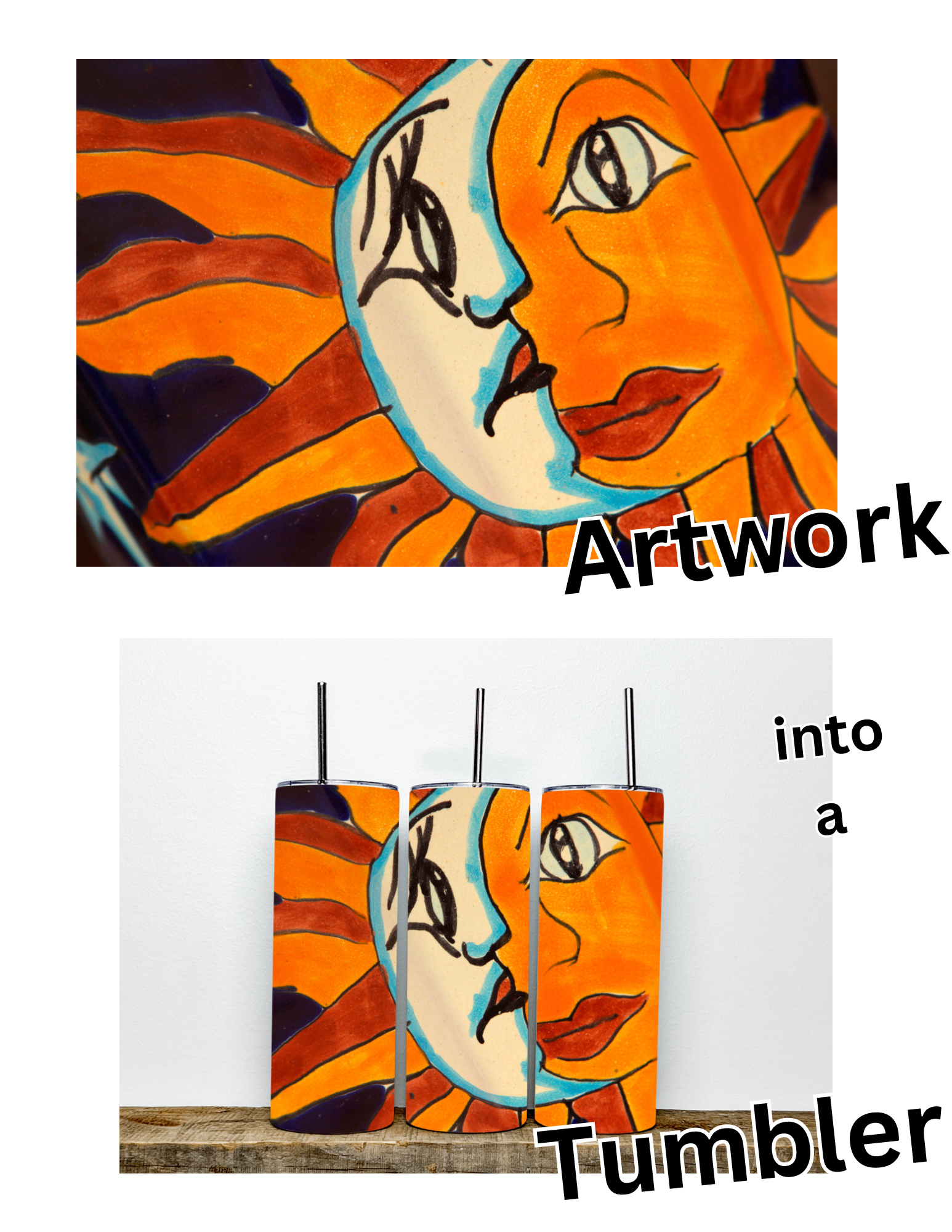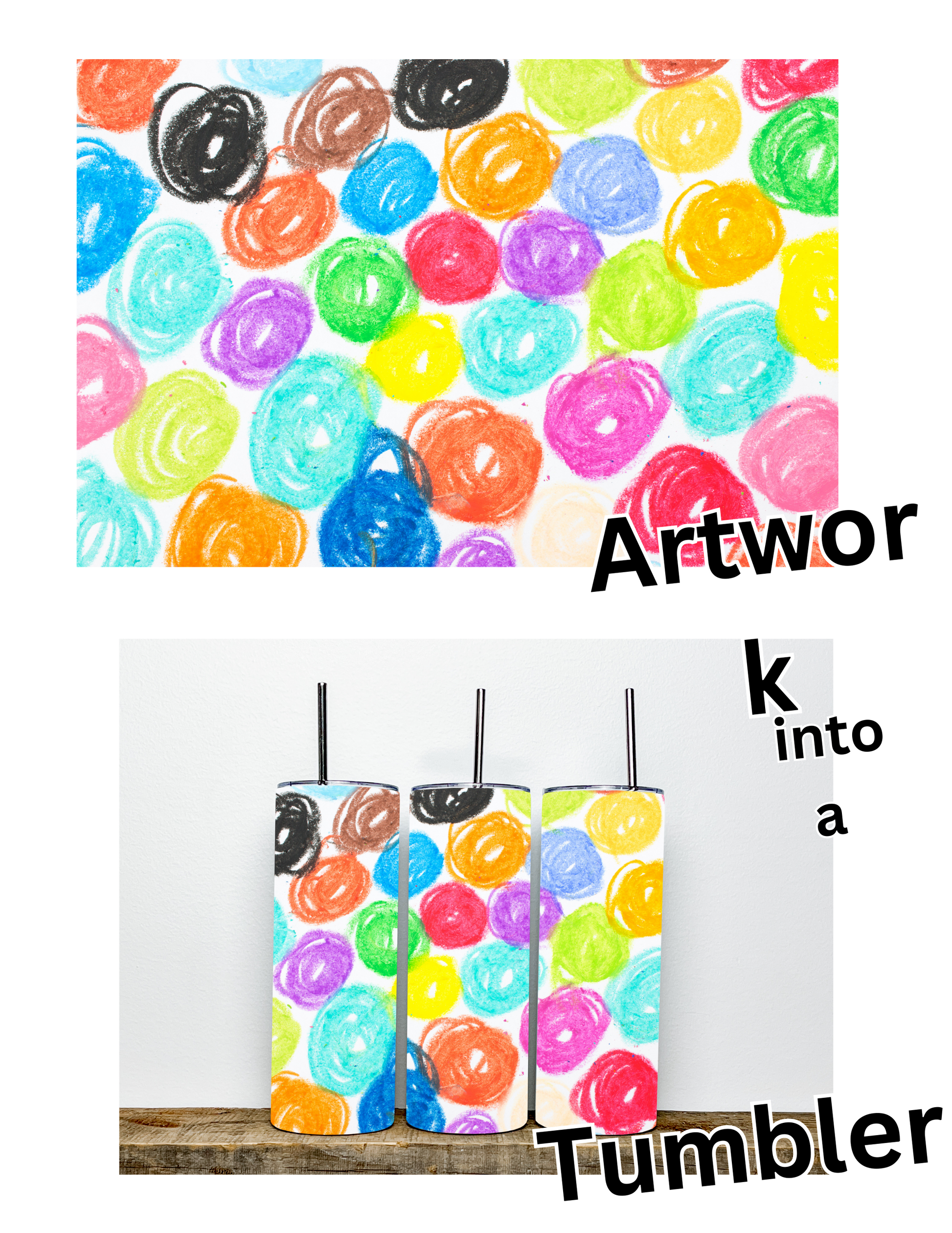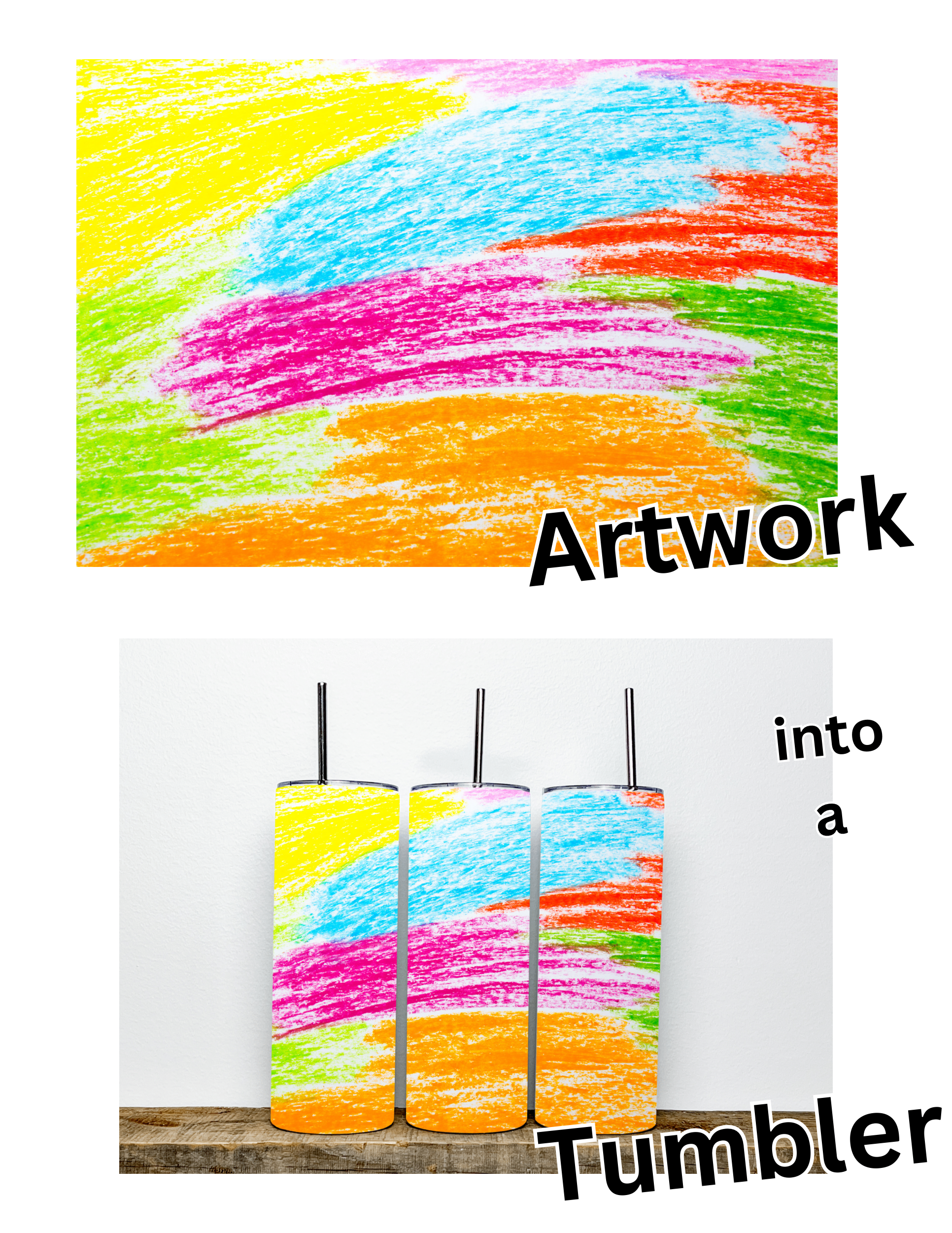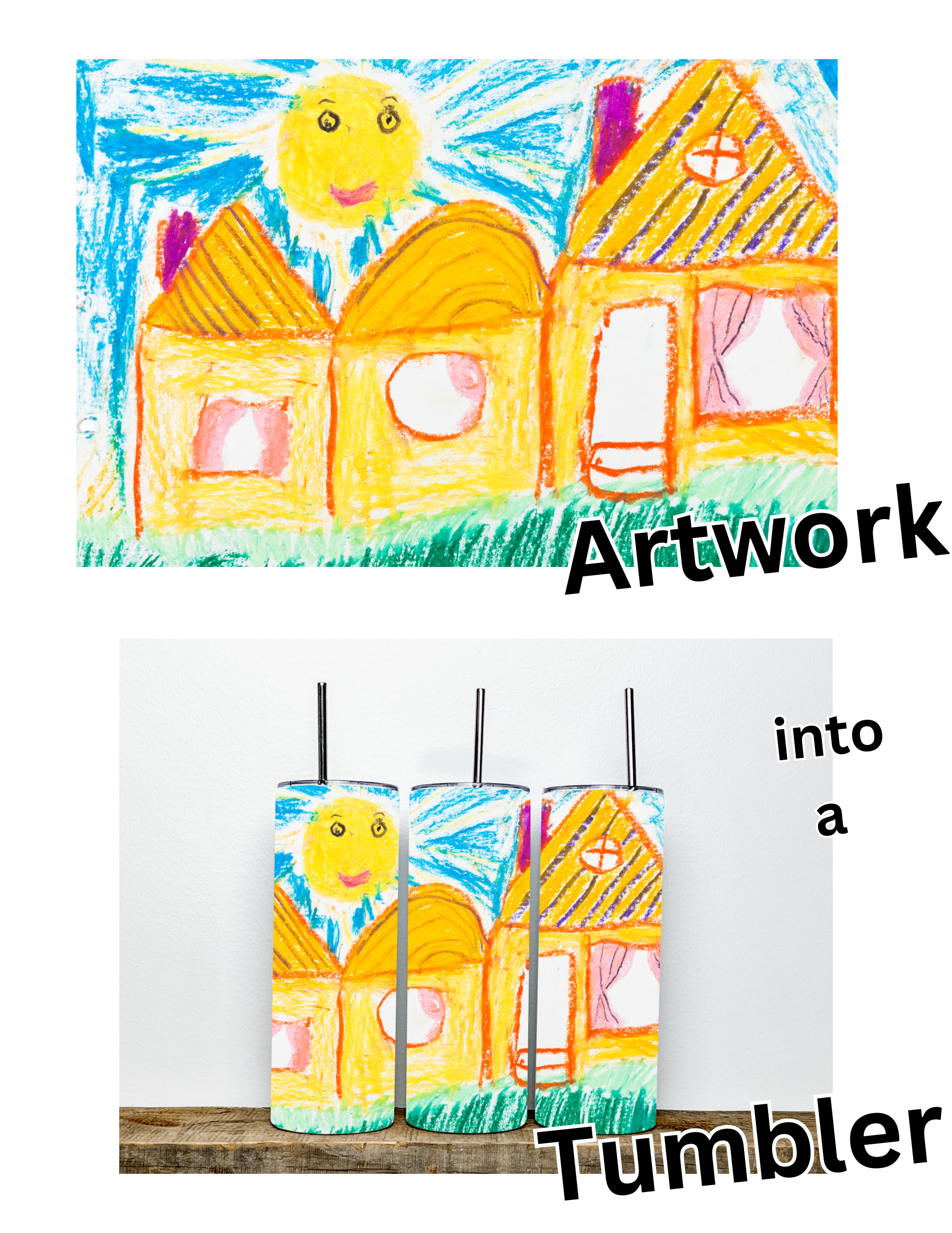 Turn yours or your child’s artwork into a tumbler. You'll get a durable, long-lasting stainless steel double wall 20 oz. tumbler. It is perfect for everyday use. The design is printed directly onto the tumbler for lasting durability. No sticker or vinyl is used, ensuring that the graphics will remain intact.