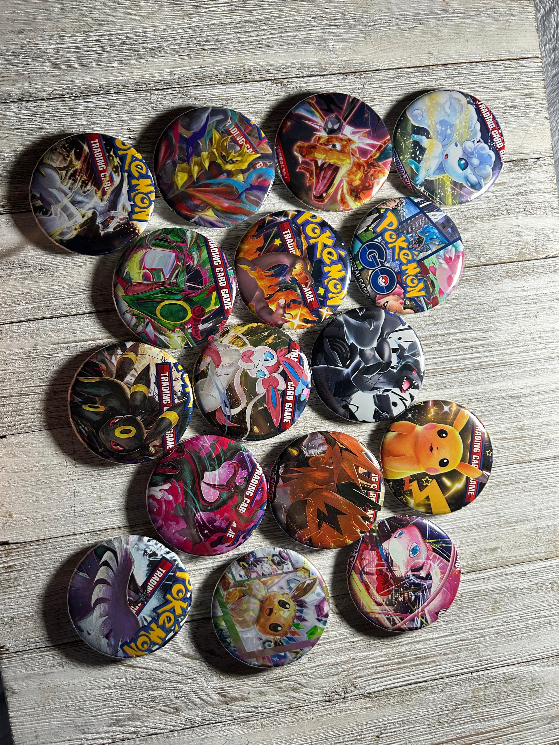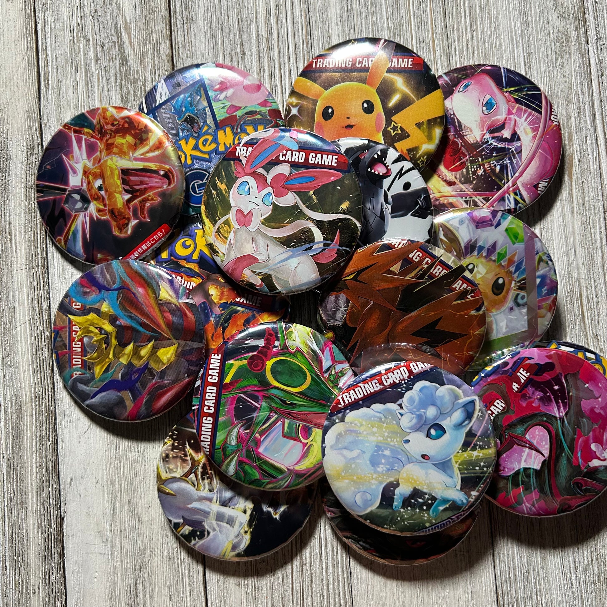 1 piece recycled RANDOMLY SELECTED TCG Pokémon card wrap into a unique button. Can be a 1-inch, 1.5-inches, or a 2.5-inch button.